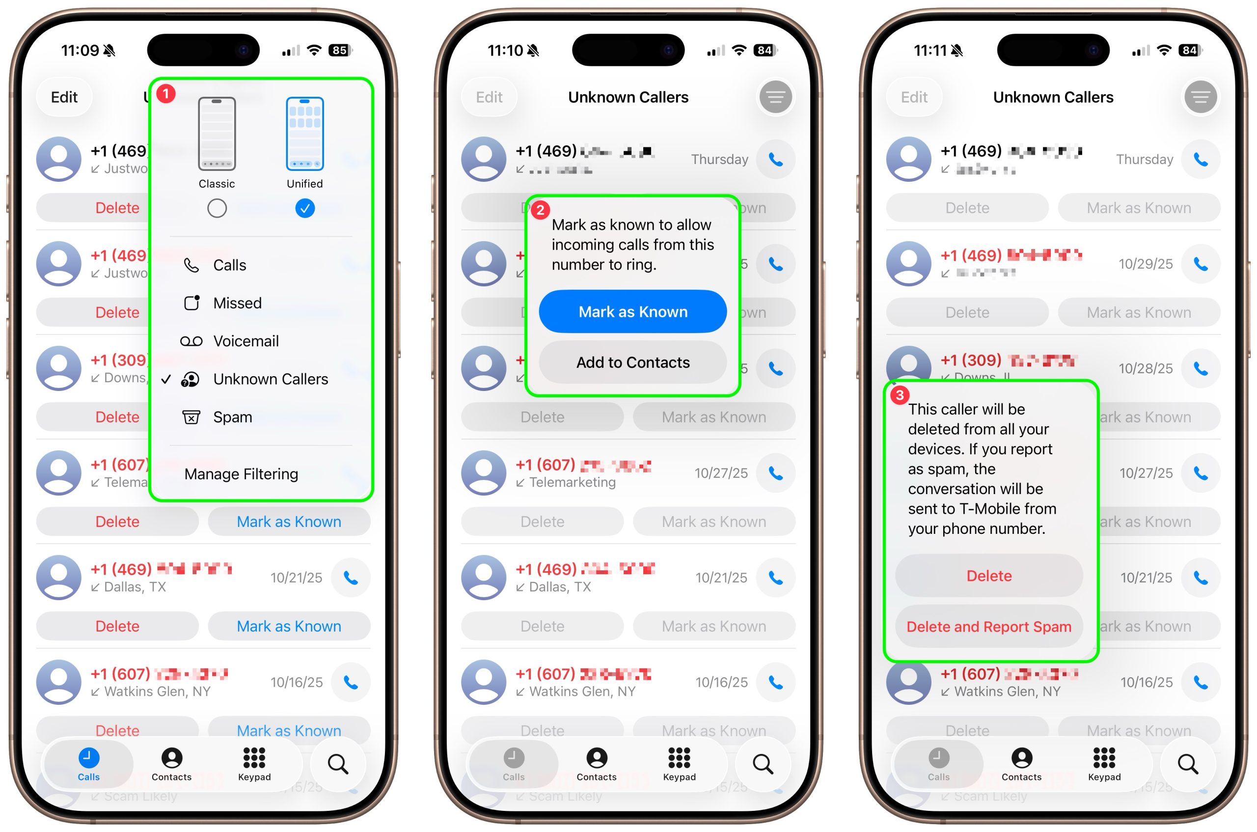 When the two Call Filtering switches are enabled, two new lists appear in the Filter menu ➊, accessible by tapping the Filter button in the upper right. In Unknown Callers, each call displays Delete and Mark as Known buttons. Marking a call as known ➋ moves it and future calls from that number to the main Calls list; deleting a call (and optionally reporting it as spam) ➌ maintains it as unknown for future calls. We haven’t seen any calls identified as spam yet, so we don’t quite know what that screen looks like.