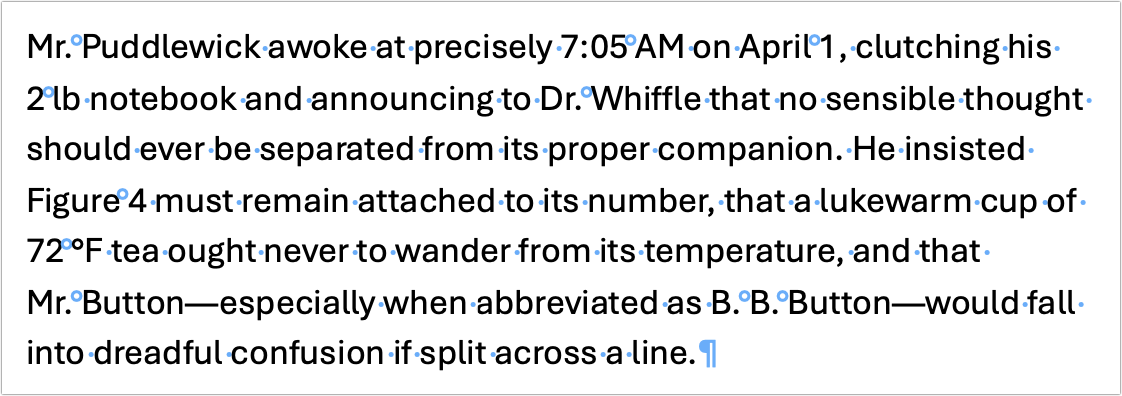 Everyone knows what a space is — it’s a breakable separator between words. By “breakable,” we mean the next word can wrap down to the next line of text. A regular space expresses the default intent: separate words and allow normal line wrapping.