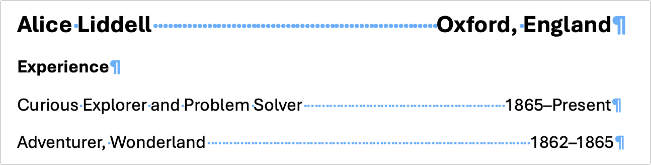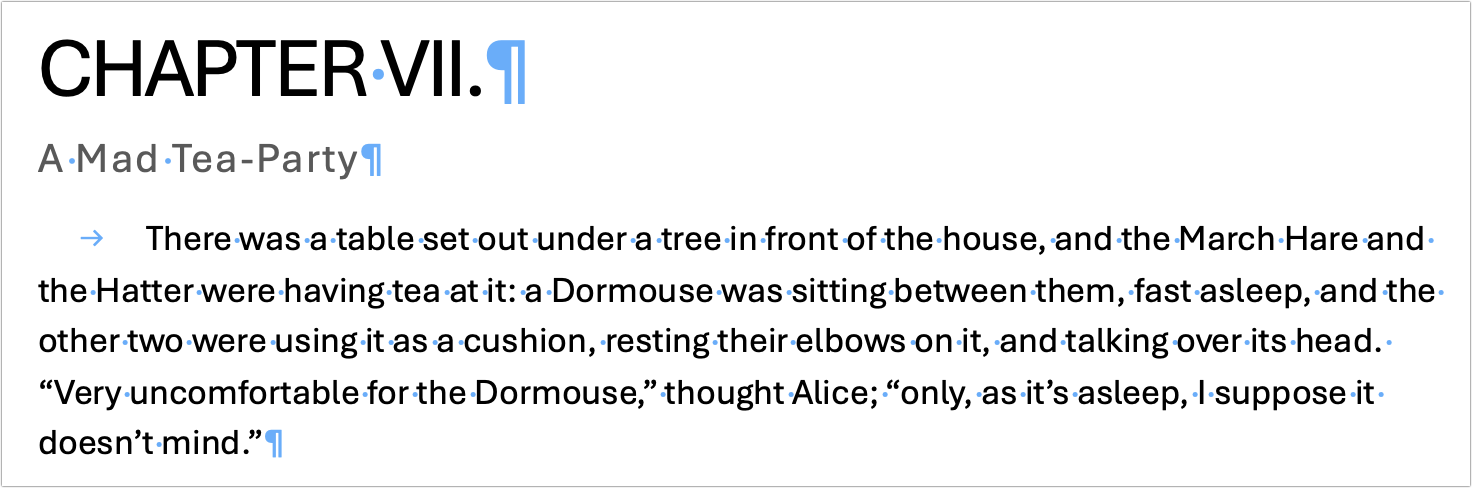 Nearly every text editor, word processor, and page layout app includes an option to show “invisibles” (the term may vary, but the concept is the same). When Show Invisibles is enabled, you’ll see dots, arrows, paragraph marks, and other symbols that represent normally invisible characters. They typically appear in a color different from the default text color, such as the blue characters in the screenshot below.
