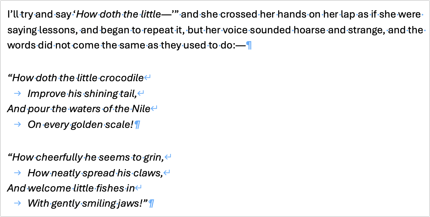 - Multi-line formatting: Some blocks of text are conceptually single paragraphs displayed across multiple lines. Think of postal addresses, poetry, and song lyrics.