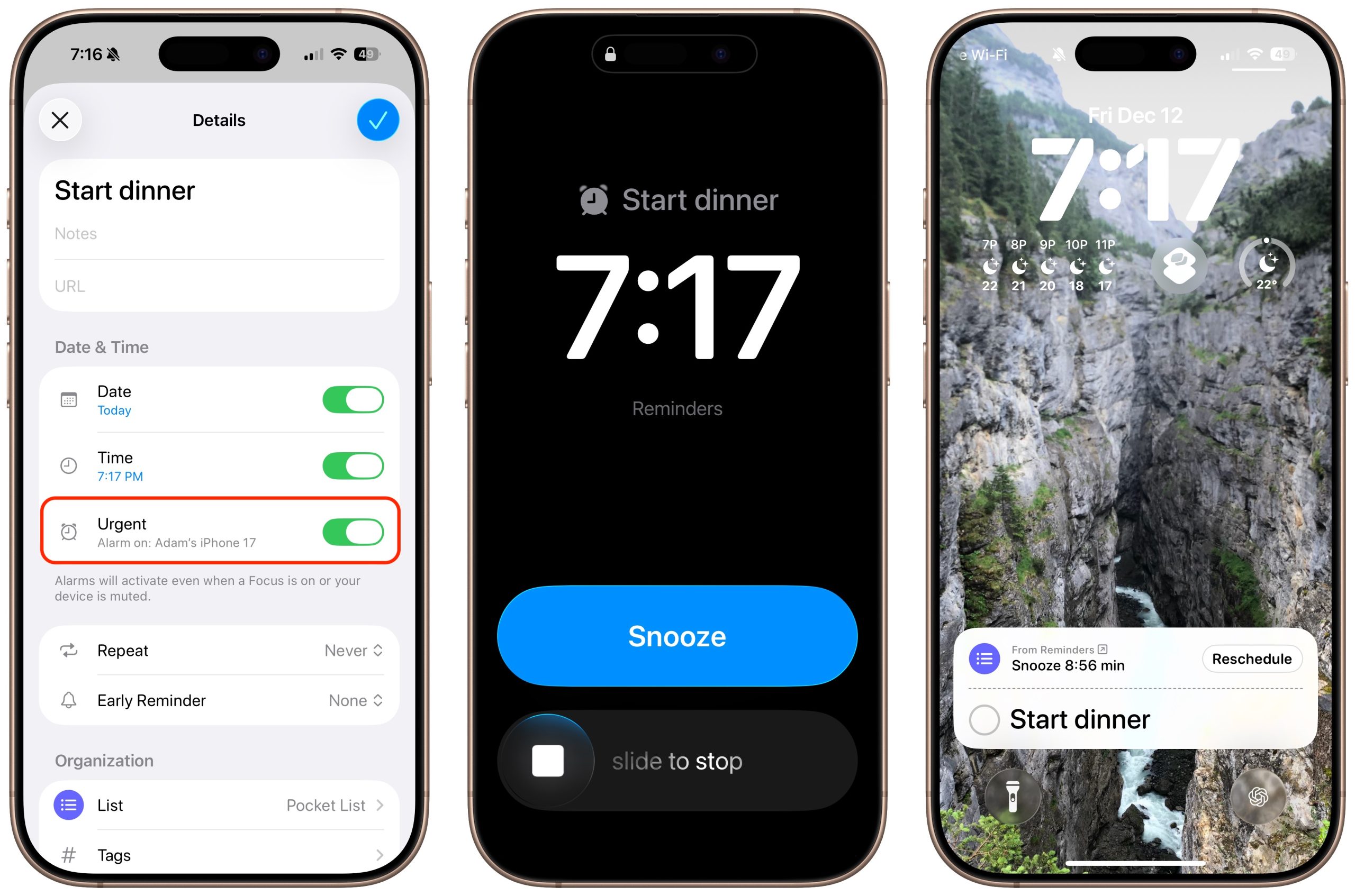 To enable an alarm for a reminder, set a date and time, then turn on the Urgent switch. (It doesn’t appear to be possible to enable Urgent via Siri.) When the reminder comes due, instead of a simple notification banner, you’ll see (and hear) an alarm on your iPhone (and Apple Watch) with options to dismiss or snooze it for 9 minutes. The alarm will continue to sound until you respond, making it much harder to ignore than a standard notification. You can even reschedule snoozed alarms if necessary.