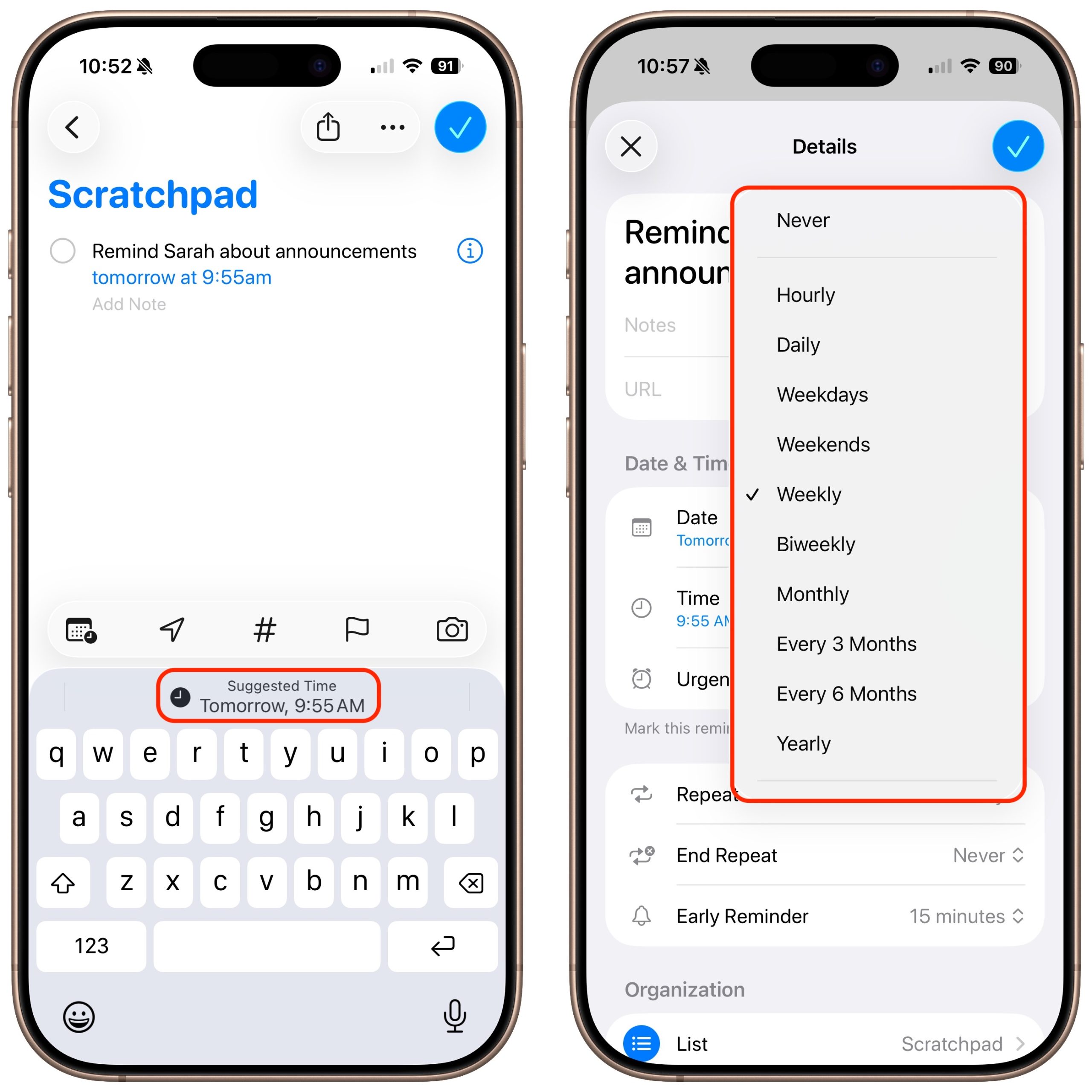 For recurring tasks, after setting a date, select an option from the Repeat menu: daily, weekly, monthly, yearly, or custom intervals. Recurring reminders are perfect for routine tasks such as taking out the recycling or submitting weekly reports. (Medication reminders are often used as an example of recurring reminders, but they’re more effectively handled in the Health app.)